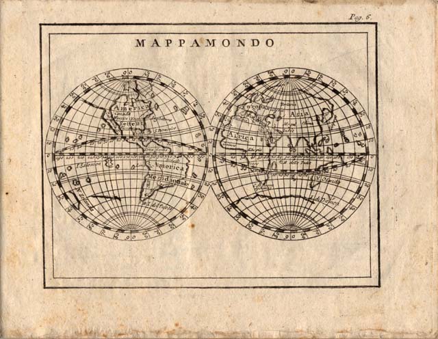 This is one map (page 6) in a bound volume of twenty maps that are from a geography textbook that is missing its table of contents. The page numbering of the maps is not consecutive. The titles are in Italian, derived from an edition issued by the Royal Academy of Sciences in Paris, France. Each map includes lines of latitude and longitude. Because the Royal Academy of Sciences of Paris was established in 1666, it is estimated that this textbook was published in the late 17th century or the early 18th century.