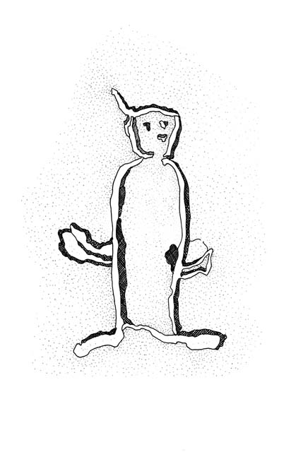 | This is a drawing of a pecked kachina figure found above Room 85/2. It has a large horseshoe shaped body, very short arms and legs, and one feather. |