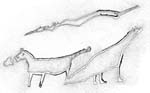 | 114 | Trio of Animals above Snake Kiva | This trio of animal forms was pecked onto the rock face near the top of the cliff high above Snake kiva in Frijoles Canyon. A serpent crawls along above a horse with wrappings around both its muzzle and tail and an imaginary animal with massive body and tail. Judging from their subject matter and style, these latter two figures were probably carved after the arrival of the Spaniards in 1540. | ![]() |