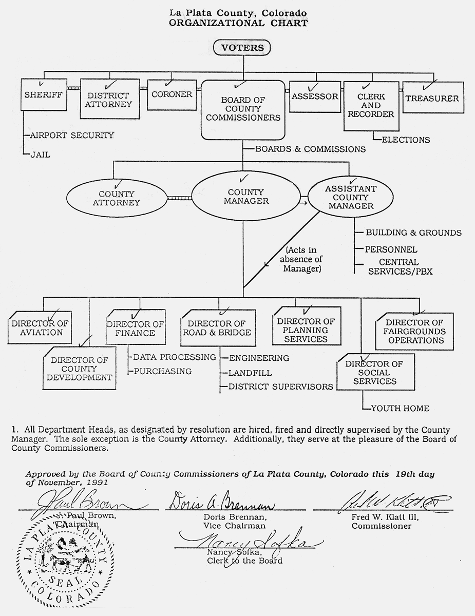 La Plata County was established in February of 1874.  By 2003, the County's estimated population was 47,467, its area had grown to 1,690 square miles, and the total 2003 assessed property value was $1,874,127,630 (up from $516,264,940 in 1993).  Its present form of government is Statutory County, with a three member Board of Commissioners.  Voters elect the County Commissioners, the Sheriff, District Attorney, Coroner, Assessor, Clerk and Recorder, Surveyor, and the Treasurer and Trustee.  The County Commissioners appoint the County Attorney, County Manager, and members of boards and commissions.  The County Manager hires, directly supervises, and fires all department heads, with the sole exception of the County Attorney, and each of the department heads serves at the pleasure of the Board of County Commissioners.