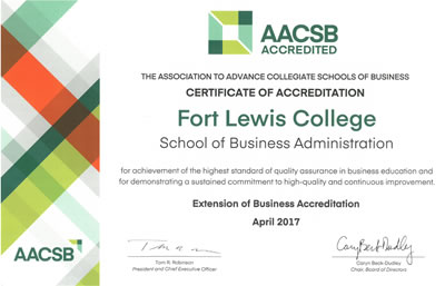 Only 5% of business schools worldwide meet AACSB's rigorous standards for business school accreditation. This distinction ensures Fort Lewis College students learn from superior faculty through high-caliber teaching and state-of-the-art curriculum. Your accredited business degree gives you a competitive advantage and membership in an elite group of business leaders.