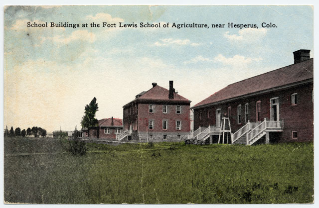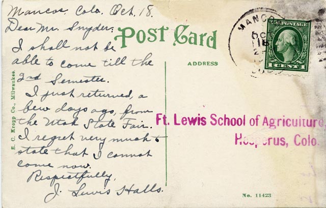 This is a summer-time view of the row of brick buildings at the old Fort Lewis School campus. J. Lewis Halles, writing from Mancos (Colo.) on October 18, informs Dean George F. Snyder that Halls "shall not be able to come till the 2nd semester." |