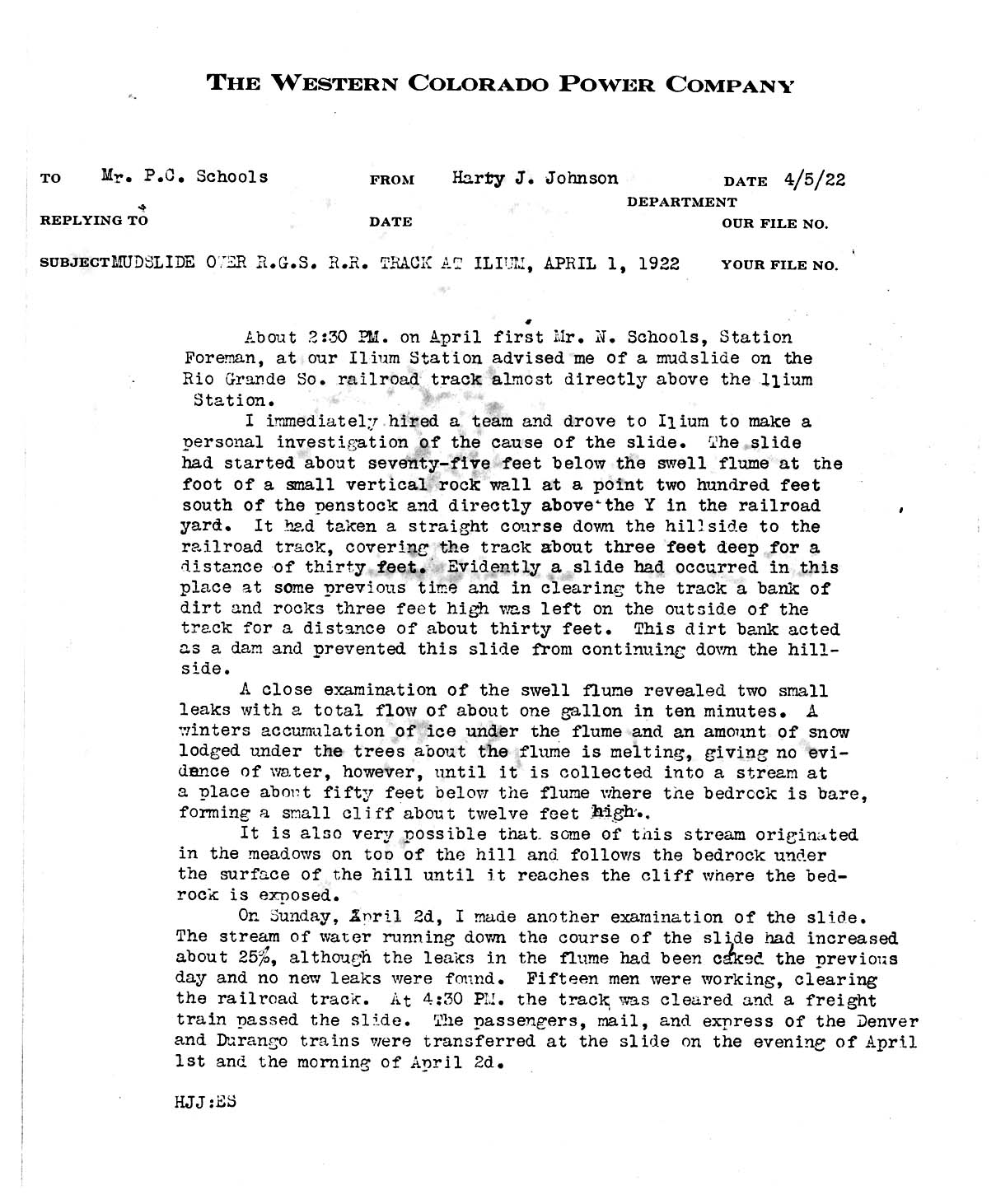 Report of mudslide from Ilium (Colo.) flume onto Rio Grande Southern railroad track, April 1, 1922