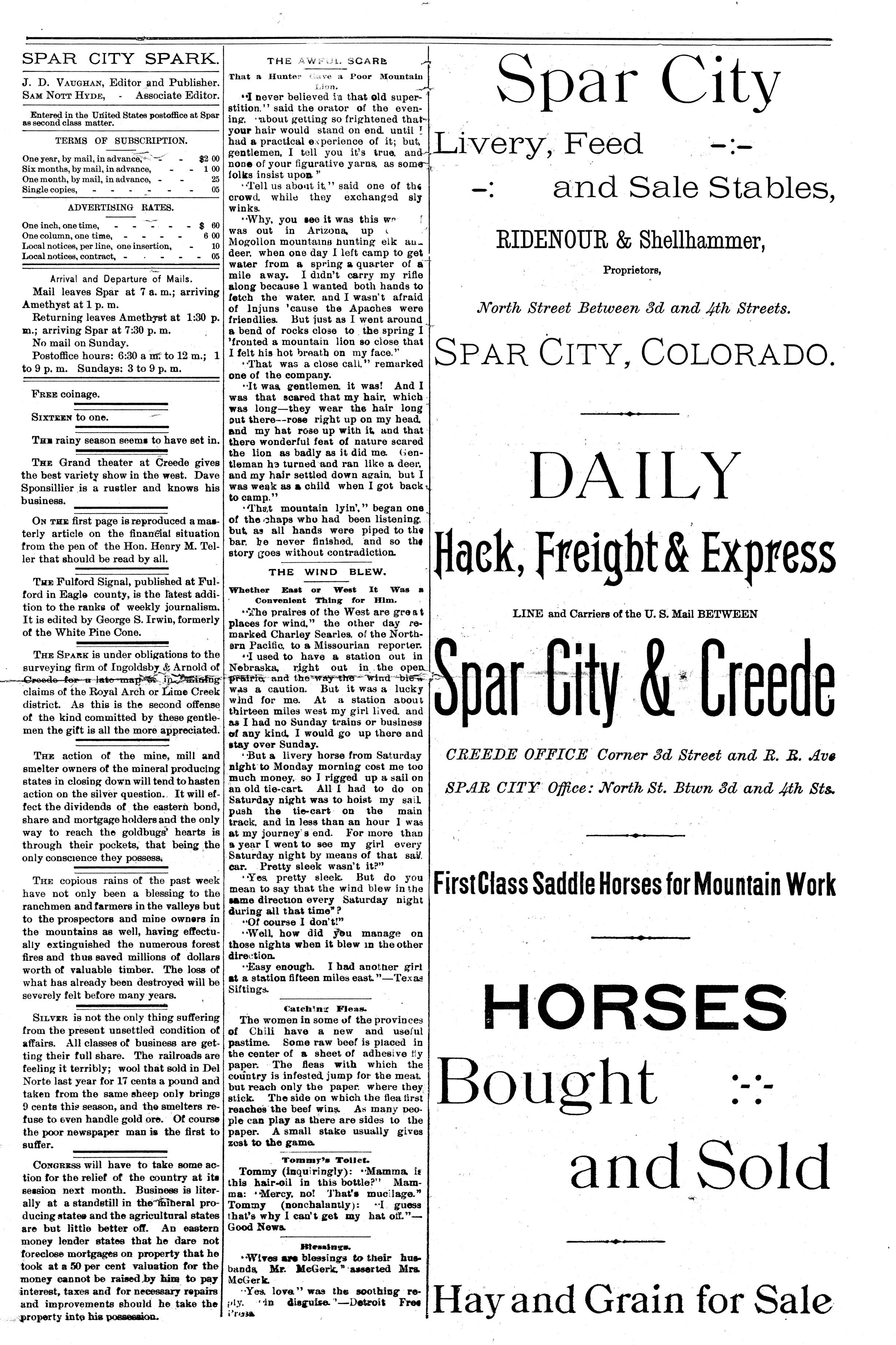 | This is page 2 of this issue from this daily (?) newspaper. Spar City is south of Creede, Colorado. |