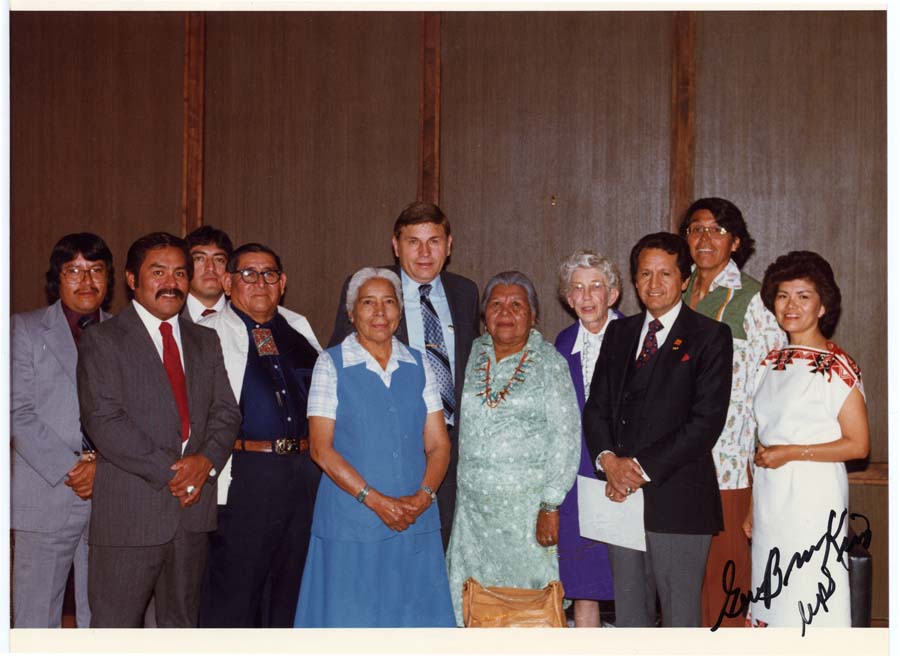 New Mexico Governor Bruce King is standing in the rear center of this photo.  Myra Ellen Jenkins is on his left, wearing glasses and a purple dress.  Immediate to Dr. Jenkins' left (right on the photo) are State Rep. Nick Salazar (Democrat, Rio Arriba)(holding a page) and (in the rear) Herman Argoyo of San Juan Pueblo.