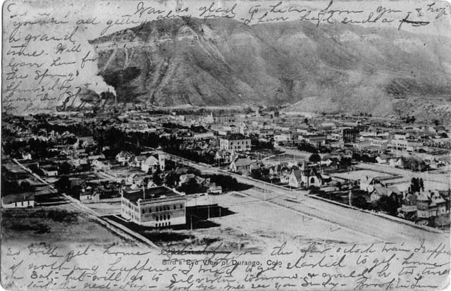 | Title: Bird's eye view of Durango, Colo. | Year/era: 1906-08-16 Undivided Back | Call#: SWM 194, Vol. 1, item #4 | |
