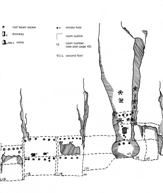 | This is a drawing of Room Cluster III at Long House focused around the tall natural chimney in the cliff face in which its residents constructed their only three-story building—Room 127. On the cliff face of the upper story and above it were pecked seven kachina figures, a serpent, and a square with a cross inside it. |