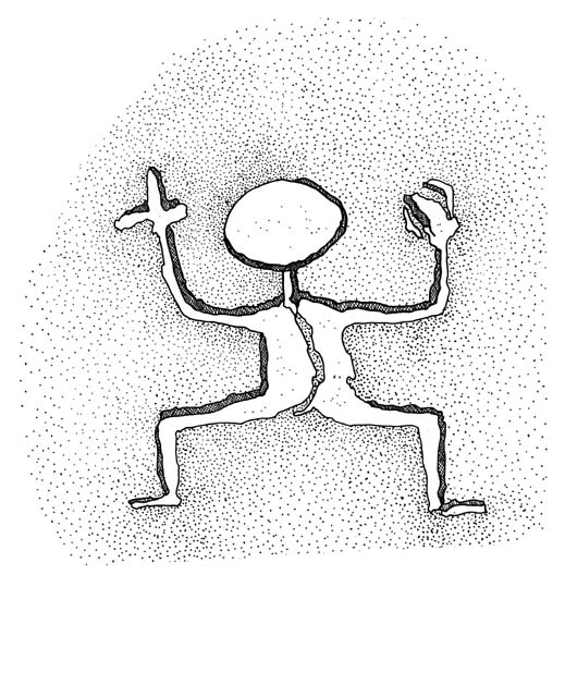 | This drawing of a Petroglyph of a kachina-like figure above Room 127/3 has a round head, broad body, both arms raised, three fingers on each hand, and outstretched legs. |