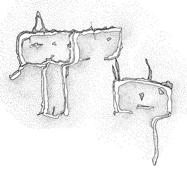 | This drawing of a close group of three rectangular headed figures has been badly eroded. It is located just above and to the right of the doorway into cave Room 50/3. |