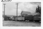 Subjects ~ Notes: Railroad stations - Colorado - Durango - Pictorial works; Durango (Colo.) ~  Passenger cars are parked in the yard, with the Durango train station behind.