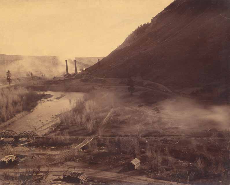 | View of the smelters at Durango (in the distance), with the Animas River running along the left edge of the photo and a dirt road and railroad tracks crossing the river in the foreground. Possibly a photo by Jacob A. Boston, who was the active photographer in Durango during that time; it was found with other early Durango photos, one of which was stamped on the back by the J. A. Boston Photo Studio. |